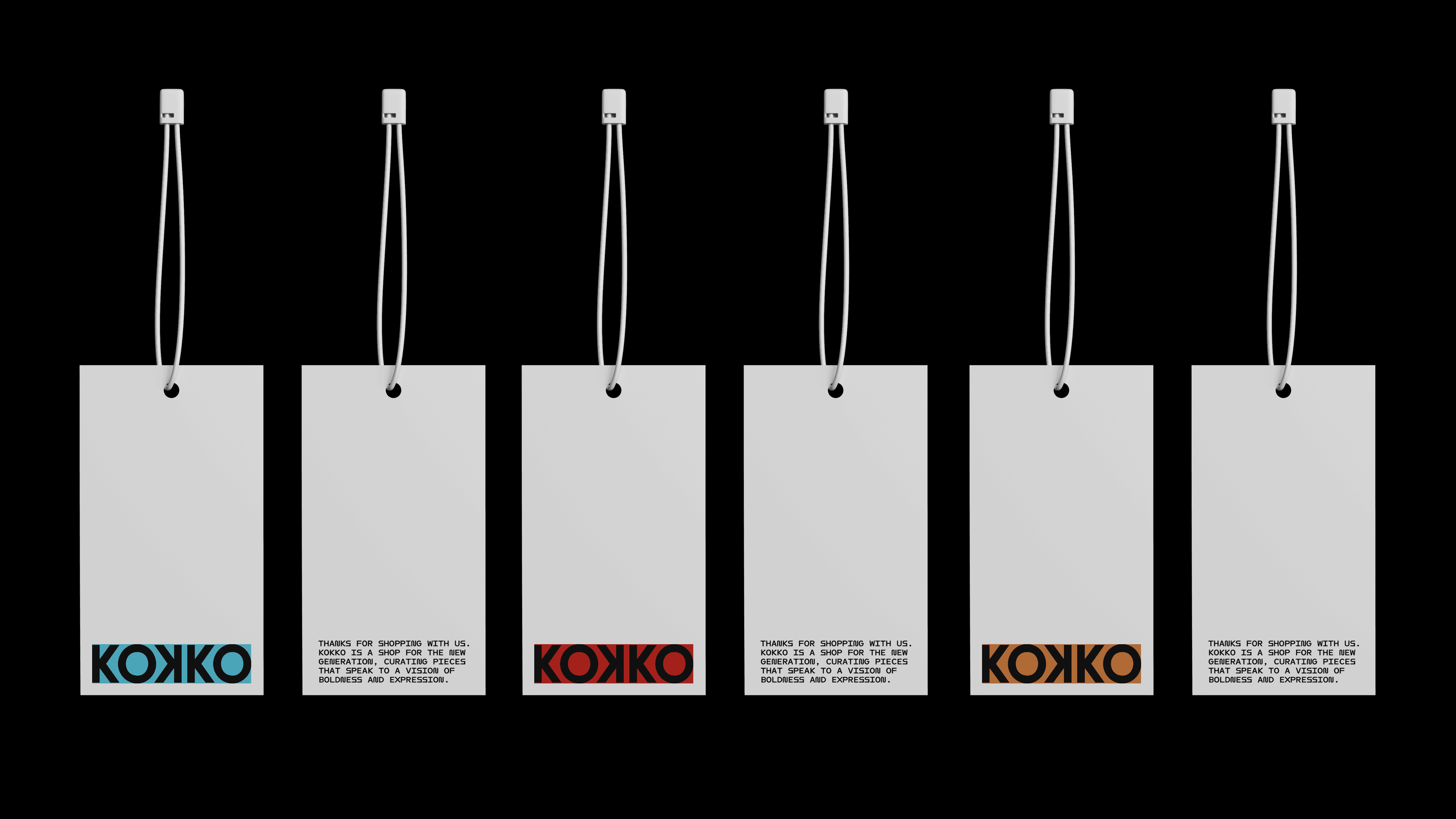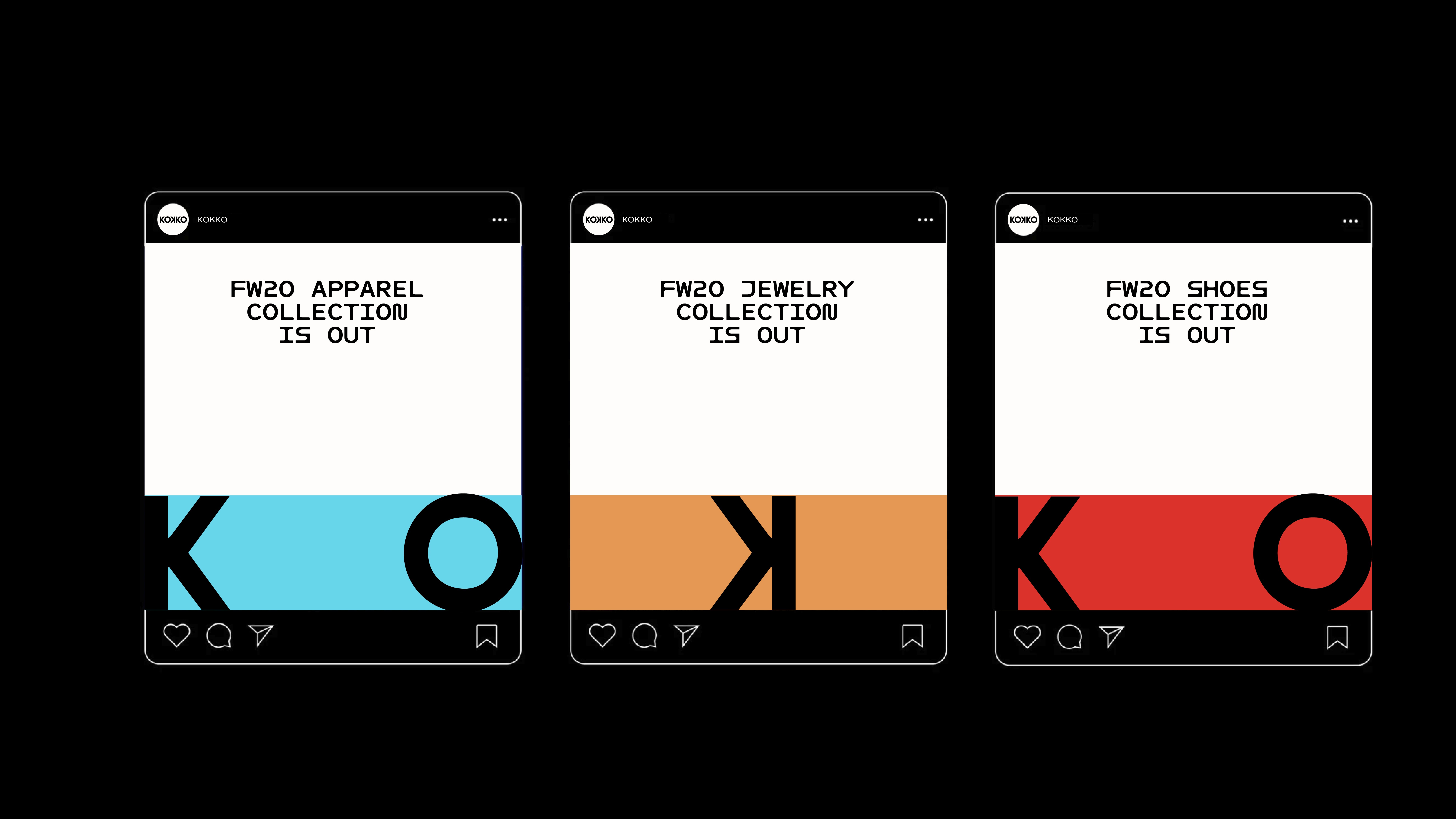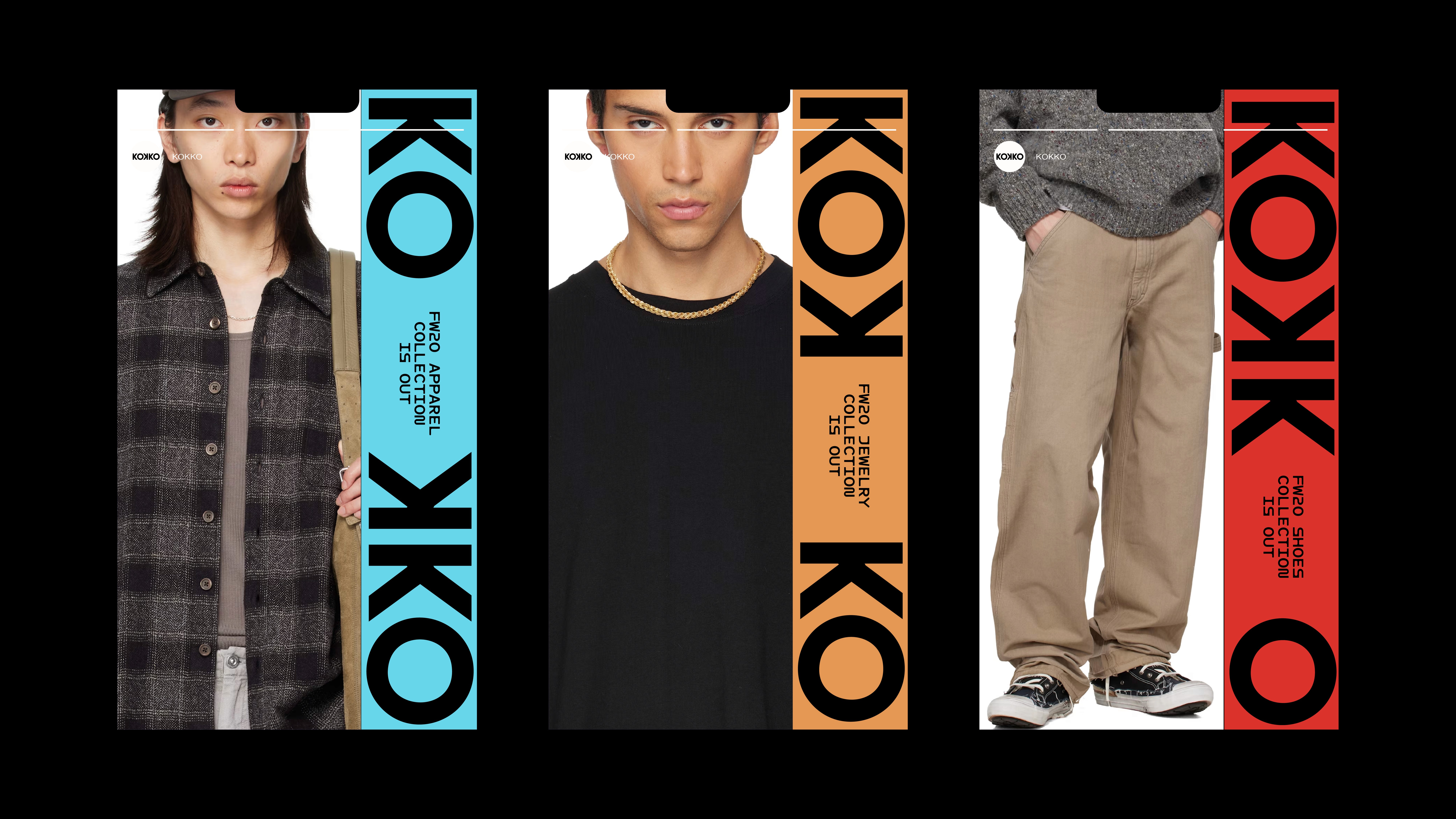The extended system introduces three vivid colors — blue for apparel, orange for jewelry, and red for shoes — bringing bold energy into the identity while organizing product categories with clarity. The logo appears flexibly across these color fields, sometimes in isolation, sometimes in layered combinations, always reinforcing KOKKO’s selective, youth-oriented ethos.